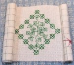 Sewing was mostly construction this month, although a few embroidery bits happened…. Arlys’ Assisi-work and flower vine, Peggy’s brickwork, a bit on a sampler, the edging on the table runner, mostly it was mundane, crafting baby toys….