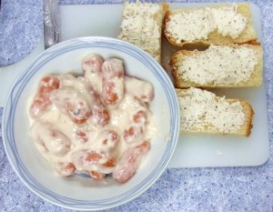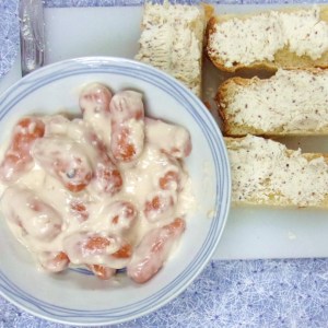 Bread fingers with tvarog and small sausages in cream of mushroom sauce