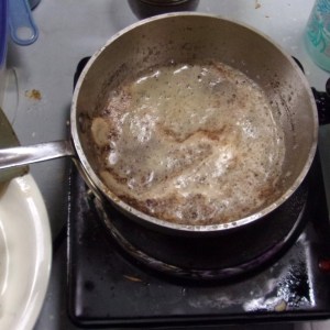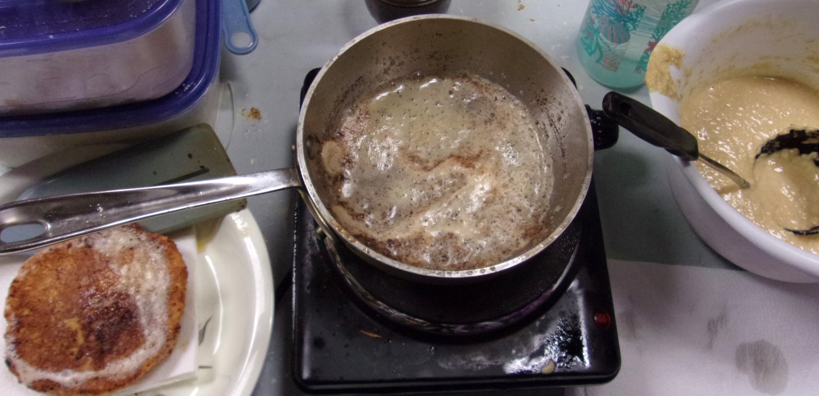 Batter on right, melting butter in center, finished cake at left