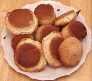 On Wednesday, Anja and Loren spent the afternoon and evening at Sasha’s and we baked seed cakes. The recipe isn’t completely period, since it’s based on one from 1640 or so, but it’s very close. We also subbed vanilla extracted in rum for the sherry and the rosewater, since we had neither, but they turned out with a nice, soft internal texture and a slightly crisp, more cookie-like than cake-like crust. You can see the “crumb” in this pic. We used a silicon cupcake pan and a shallower muffin-top pan. The muffins turned out fine, but not “cake-ish” enough. The ones in the biscuit pan were overfilled, but were the perfect depth. We made 12, but because of the “overfill” we’re guessing that the double recipe will make 16-18 instead of 12. Recipe below.