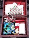 - ASLIV – 230 plus 4 puppets, 4 powder fort, 8 cheese spice and 9 powder douce packets, 1 kiss-lock pouch, 9 tiny bobs, 7 pincushions, 3 pins, 3 snip case w/snips, lucet cords, 25 pouches for block-printing, 1 medium pouch, 4 small pouches, 12 bookmarkers, 14 unfinished pincushions, 1 sewing kit (except for bone needle), varnished stuff (124), 2 emery strawberries, 1 woolen spool-knit cord, 48 key bottle openers