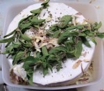 - Cover bottom of box with one onion, bayleaves and garlic and ½ the oregano/basil mix