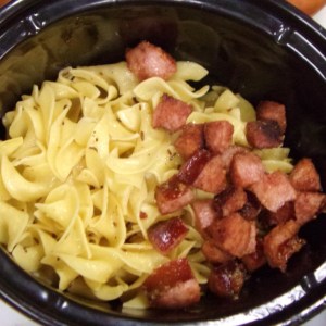 Noodles with caraway butter and sausage being added