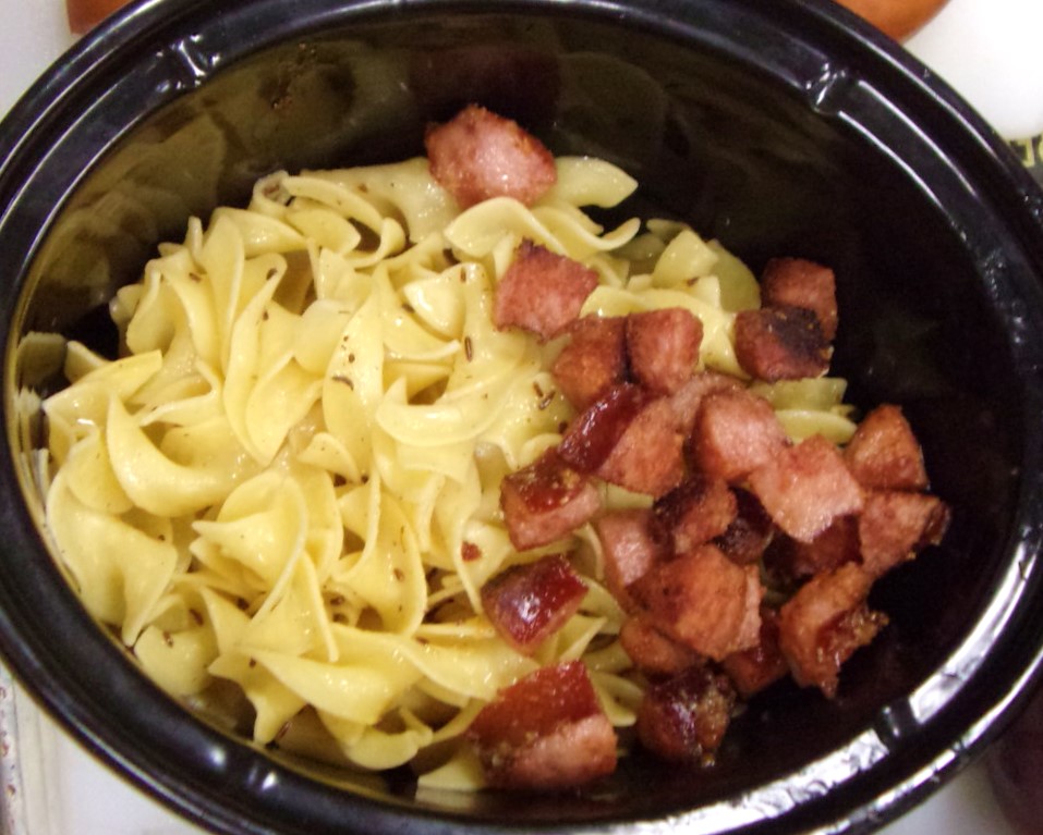 Noodles with caraway butter and sausage being added