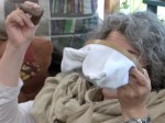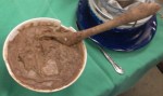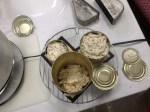 It curdled beautifully and with much more cheese than last time, leaving only about an 1/2 gallon of whey. It “broke” from the cheesecloth very cleanly, unlike the last batch when we had to do a lot of scraping. After letting it cool a bit, we packed the molds and weighted them and left it to stand overnight. One lady took home the frozen whey from the last batch and we got the next into the freezer. Anja unmolded and fridged the cheese Friday morning.