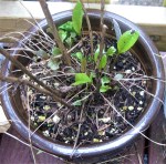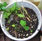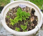 During Herbs in the Garden, Anja got some seeds in, (particularly a whole pot of the nettles) and then planted extras of radish, lettuce, cilantro and peas. She harvested leeks, garlics, a couple of things that turned out to be walking onions and some greens, and we got the bee balm and petunia shifted to good places along with the columbine and the fern whose pot that is, that has decided it’s alive after all. She noticed that there were some tiny leaves in some pots and by Thursday evening it was obvious that new lettuce and peas were coming up.