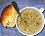 The soup. It’s a sortof mashup of various things. I started with chicken broth and a package from last fall of frozen leek/onion/potato/zucchini, added dried mushrooms, then garden gleanings which were mostly leek and garlic, with some turnip greens and a few carrot tops, plus one very tough and lonely lettuce, salt and caraway (too much salt) and eventually cream and rice, since there was too much broth.