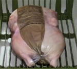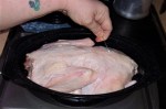- Roast covered in 350F oven 2 hours, breast down, flip and pour off cooking liquid.