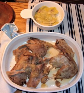Note from Rombauer’s Joy of Cooking – “Duck and goose are carved in the same basic way as chicken and turkey, except that their leg and wing joints are located closer to the back and are harder to get at. For this reason duck and goose are best carved in the kitchen rather than at the table (but do exhibit it at the table first), since disjointing the bird is inevitably a bit of a struggle.” She’s not kidding!