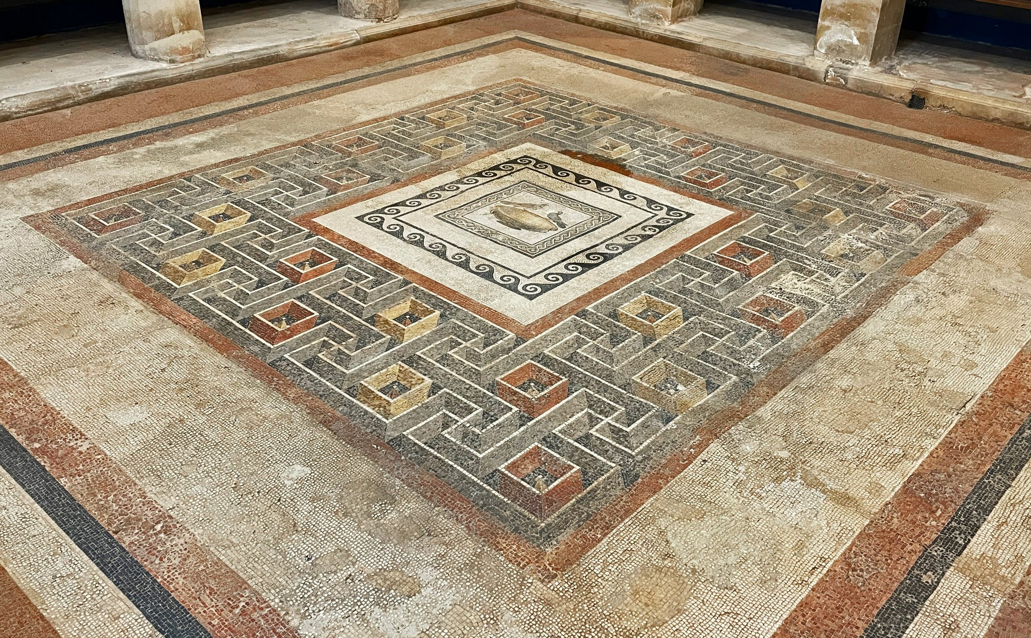 Roman mosaic of a labyrinth rendered with a remarkable threedimensional effect in the peristyle courtyard of the Domus Romana Malta
