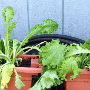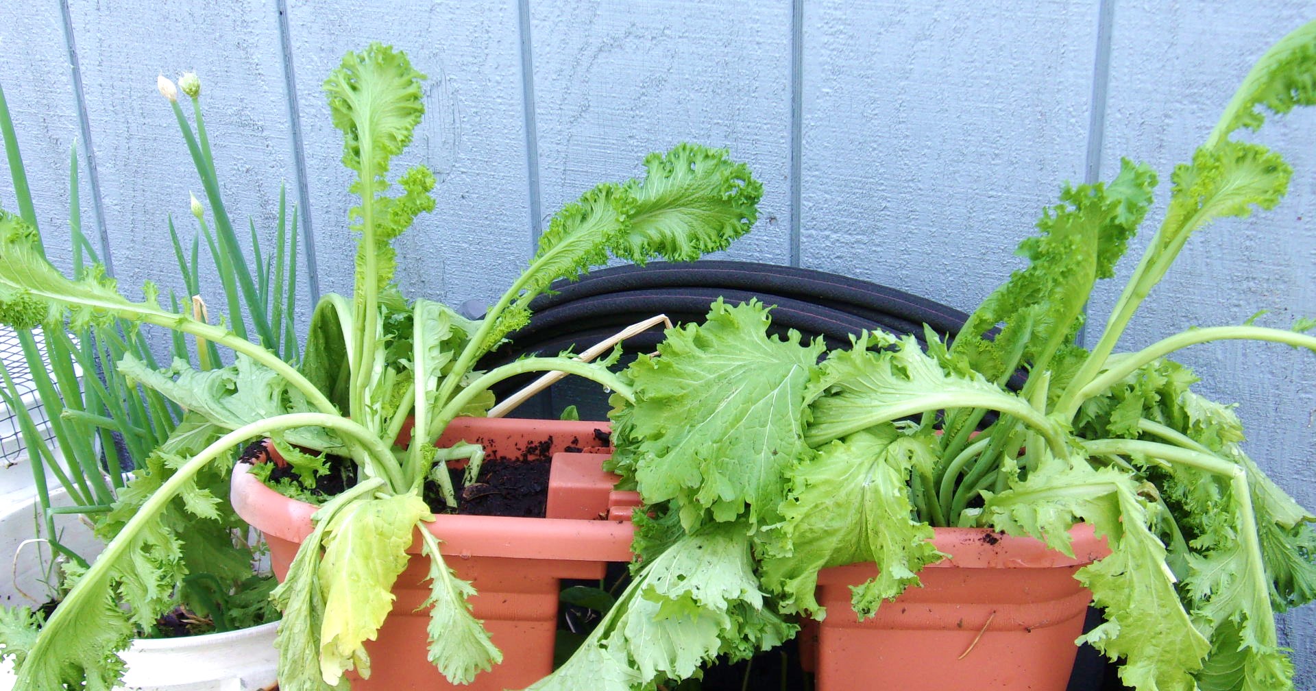 Mustard Greesn with alliums (garlics, I think) to the left
