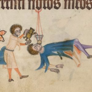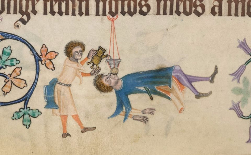The beginnings of your winning Alpine Scholar entry A beer bong from the Luttrell Psalter BL Add MS 42130