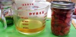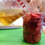 Cookery – Strawberries – On Saturday, as part of herbs, we prepped most of a 2 pound box of strawberries. The best got eaten. The least ripe went into a strawberry pickle and the most ripe and bits went into a sugar preserve and the 5 left over got frozen for breakfast. Now, we don’t have a clue how period these methods are… at least for strawberries. All the strawberries were cleaned, sliced and packed at the same time, then the pickling brine got done and added.