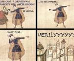 Probably public domain, but posted by Eric Knibb on Facebook on SCA KNOWNE WORLD HUMOR. I remember a story about an SCA event. Two fighters were getting ready when one of them discovered that the hose clamp on his basket hilt was broken. The two of them, in armor, jump into the one guy’s truck and drive to a local hardware store. When they enter the store all Conversation stops. They quickly find the needed hose clamp and take it to the counter to pay. The clamp was a dollar and some change so the one fighter put two one dollar coins on the counter. The poor girl behind the counter just stares at the coins for several seconds before she says “oh right” takes the coins and gives the man his change.