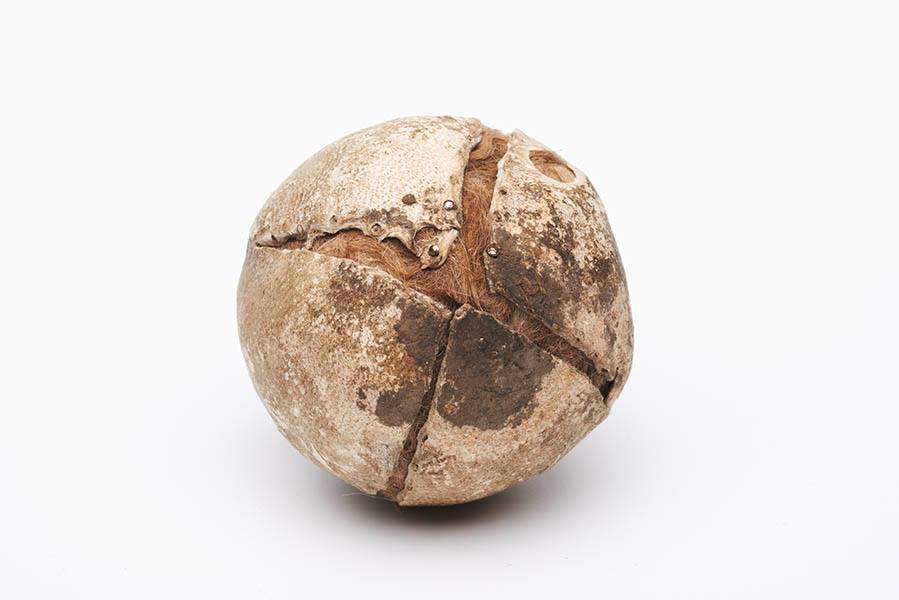 A ball for ‘real’ or ‘royal’ tennis, fashioned from leather with a stuffing of compacted dog’s hair. The leather has been cut into quarters and the segments are stitched together along the seams. Most of the stitching has come apart and there a several holes in the leather. This ball was discovered in the rafters of Westminster Hall in the 1920s. There is no evidence that real tennis was played at Westminster after c.1520 and so this ball almost certainly dates to the late 15th or very early 16th century.