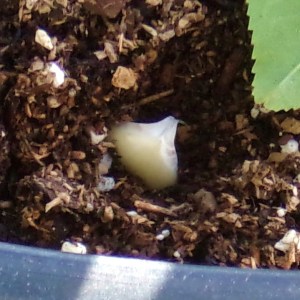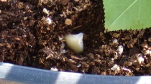 A tiny garlic (that’s a rose leaf) about to be coverd with soil.