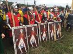 With iron helms and sword and spear