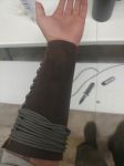 Sewing – Amor – “1 1/2 hours from “I should make a vambrace” to finished. Not pretty. No plans. Pocket knife, Paracord, spare wallet leather. Excess Paracord was not intended, but serendipitous for a ” oh crap! I need cord!” Type of scenario. Leather was just stock, not softened or stretched or really worked at all. A bit stiff but after wear, I think will be decently comfortable. So long as I don’t pull it TOO tight…