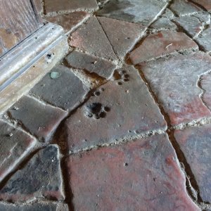 Kitty prints in medieval floor tiles Wormleighton St Mary