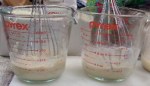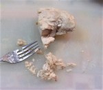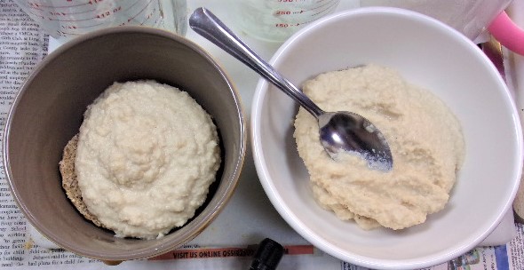 Next up was “chicken flour”. This is a recipe from the Meister Hans cookbook 1460. (see recipes) We started with boiling some chicken breasts, then picked the two closest in weight. I had tried a little of this before, but wanted pictures, this time. One breast was fork-shredded and the other went into the small food processor, then both onto different trays in the dehydrator. After 8 hours both were dry enough to shatter. Both the food processor and mortar were in the dishwasher, so that had to wait. Late Wednesday they were processed. We couldn’t find the mortar, so it was just the ones for the processor. The ground turned out to be more “flour-like”.