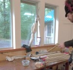 “Each of the modern arrows has one step in the arrow making process. I have tools I used to make the period arrows, including a doweling jig, a knocking jig, and a tapering jig. In the Tupperware is hide glue and verdigris. I cut up cow horn to use in the knock of the arrows. The arrows I’ve completed are in the arrow bag, which is a predecessor to the quiver. ” YiS, Andrew