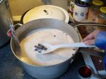 Eventually we moved into the back, got the spices ready, poured in the milk and started and it took over 1 1/2 hours to get the stuff up to temperature! Or close enough that stuff would curdle, at least. The whey was still a bit milky, but not quite so much as last time. We think that it was the hotplate cutting in and out that made it take so long, but eventually it was frothing and we put in the vinegar. We used mustard, celery seed, home-grown caraway seed and garlics.