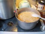 The worst part of making this style of cheese is that it has to heat slowly, so it seems to take forever. At 9:30- it was still only up to 115F. We’d go back every 15 minutes, stir, test the temp, turn up the heat one more notch… at 9:50 it was at 135. …and at 10:45, only to 175….
