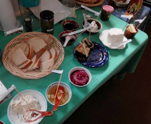 We started a little later than Anja had hoped, waiting for someone, but gradually setting up. Once the last person arrived we moved out to the front to snack a bit (the ladies brought cheese, bread, crackers and garlic jam!) and do the first part of things which needed to be what we were doing with the cheese.