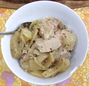 Essentially it’s a pork loin roast, cooked in a crockpot with 1 cup of water (or white wine, this was a sweet white) a good shake of caraway seed (you can see approximate amounts in the pic) 2 onions, peeled, 1/4’d and sliced and a shake of salt. Cover and cook on low for 4 hours (use a thermometer, crocks cook differently!) or 2 1/2 on high…. approximately….